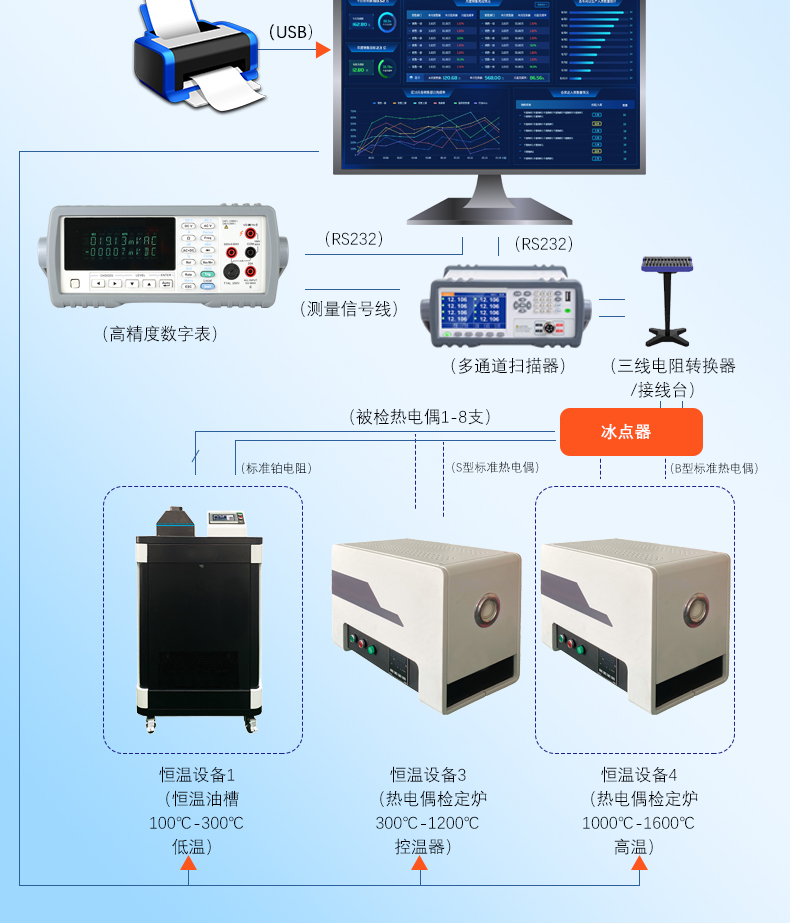 該設備系統采用集成式控制由智能溫度控制器實施對恒溫裝置(檢定爐、恒溫槽)的溫度控制,將測溫偶(阻)測得的檢定爐(油、水)電信號,由高精度7 1/2位數字多用表轉換為數字量通過串行口通信端口傳送到計算機。計算機根據內部系統的相關規程計算程序對恒溫裝置的溫場進行監控,保證被控對象(檢定爐或油槽)按要求升溫或控溫。在達到規定的要求后,對被檢偶(阻信號通過智能多通道掃描器切換進行數據采集,得出檢定結果同時相應數據進入數據庫用于查詢和統計。在檢定過程中,計算機應實時顯示各種參數。完成檢定后,通過打印機可打印出各種報表